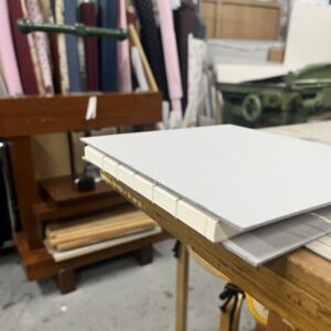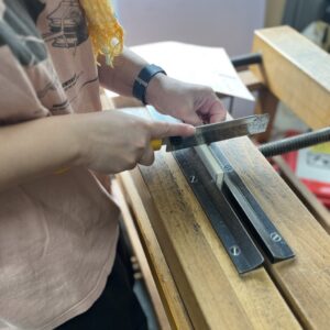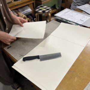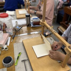 今日は、かがり台を使って綴じるレッスン。全紙サイズから荒裁ちで切り出し、折丁づくり。さらに、のこぎりで目引き。そして、かがり台のセッティング。あとは、縫い物のような織り物のような要領で綴じていきます。綴じ終わったら背固め。来月は表紙です!