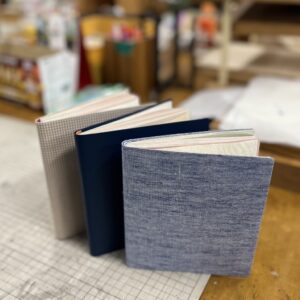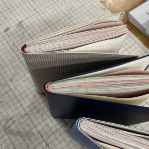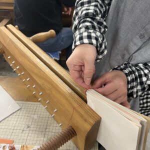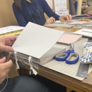 2025年の4月はじまり、月1の2コマクラスです。今日で半分!折り返し地点にきました。基本の糸かがりや表紙の仕組みから一歩進んで、地券紙芯材の辞書のような丸背の製本を。綴じはフレンチリンク、花布は編まないけど綴じつけてしっかりと。
